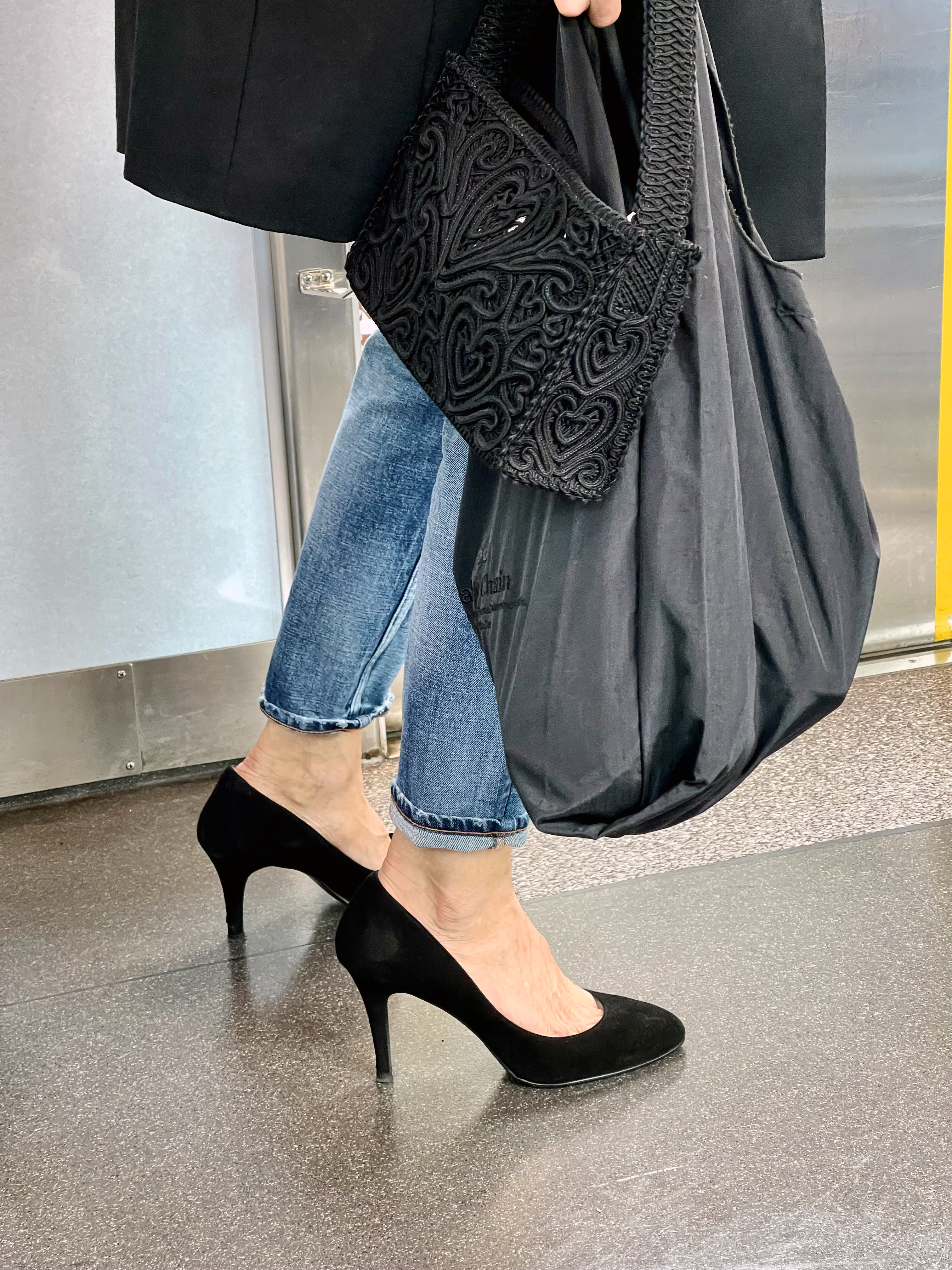 美しいカシミアの黒のジャケットにパンプスのバックスキンがシック、小物はノーブランドなのに、そのコーディネートは彼女のための小物を集めたかのようでした。