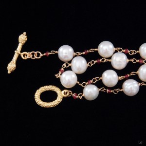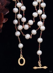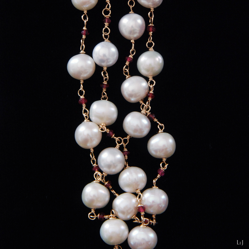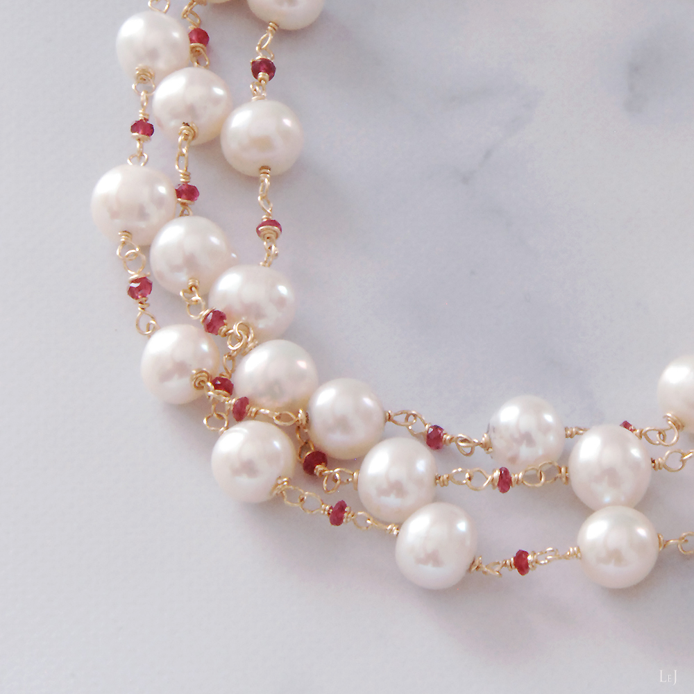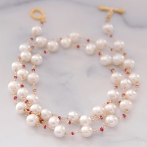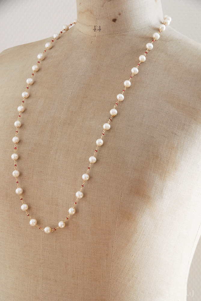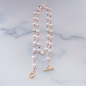 このネックレスは、かなり以前に製作したパールのネックレスをアレンジして、間にピンクトルマリンを入れてぐっと華やかなネックレスに生まれ変わったものです。淡水パールにはまろやかさや柔らかさがあり、アコヤパールとはまた違った華やかさがあります。