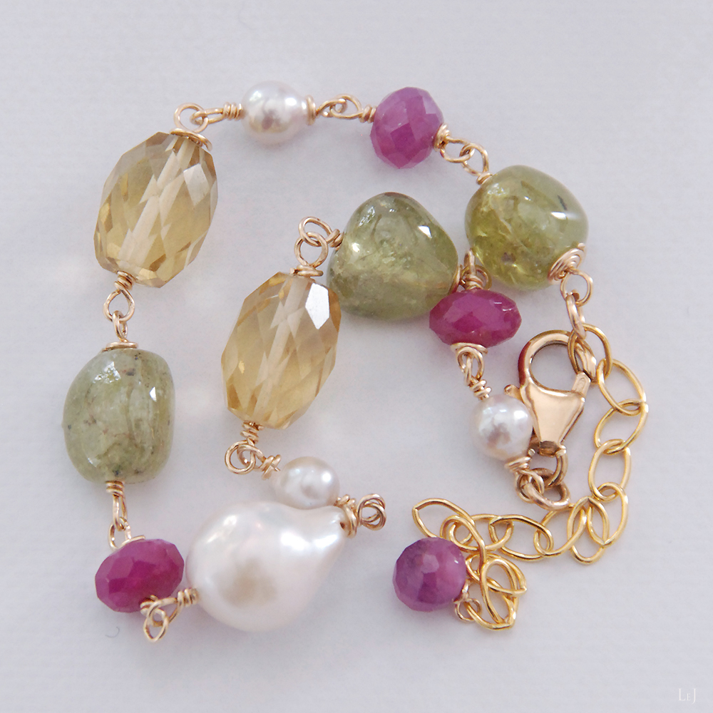 センターになる部分にはほんのりとやわらかなホワイトの有核バロックパール、少しグレイがかったアコヤパール、カットが美しいルビー、瑞々しいプリナイトとレモンクオーツ。一番粒が大きいレモンクオーツは12×9×9mm。内径14cm +5cmのアジャスター。アジャスターは長めに付けており、お好みによりカットしたり取り外したりしてお届けします。