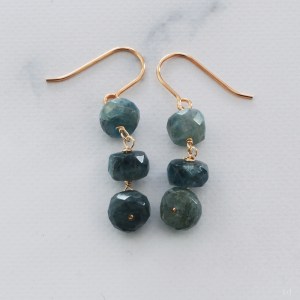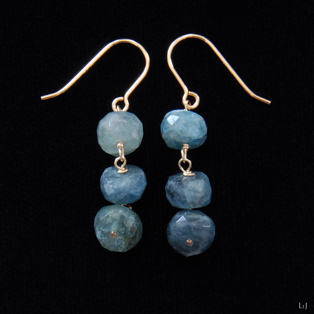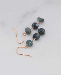 カシミアのライトグレイのニットを思い描いて作りましたが、シンプルなニットのドレスなど、ウエアの邪魔をすることなく、着ける人を引き立てることができる仕上がりです。白いニットにはとても映えそうですし、飽きが来ることなくお着けいただけそうです。モスアクアマリンは⌀8mm×4mm。ピアスホールからの長さは42mmほど。