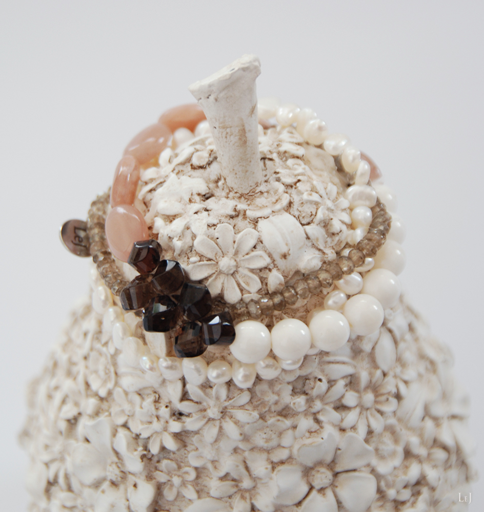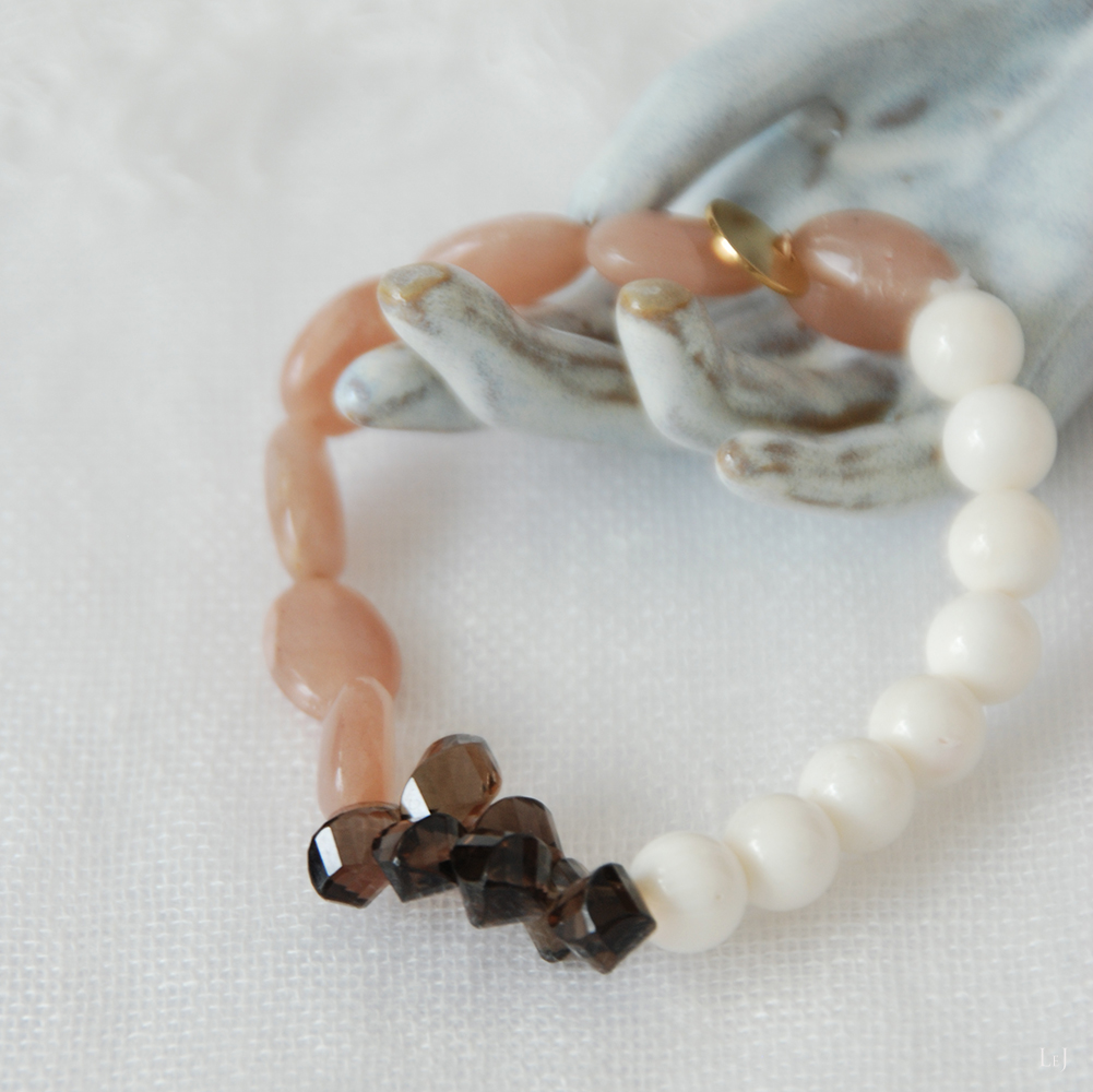 肌馴染みの良い素材を使った、一年を通してコーディネートを楽しんでいただけるトーンのブレスレットになりました。ボーンのホワイトを外側にしたり、ピーチムーンストーンを見せる側にしたり、お手持ちのパールのブレスレットとの重ね付けも素敵です。