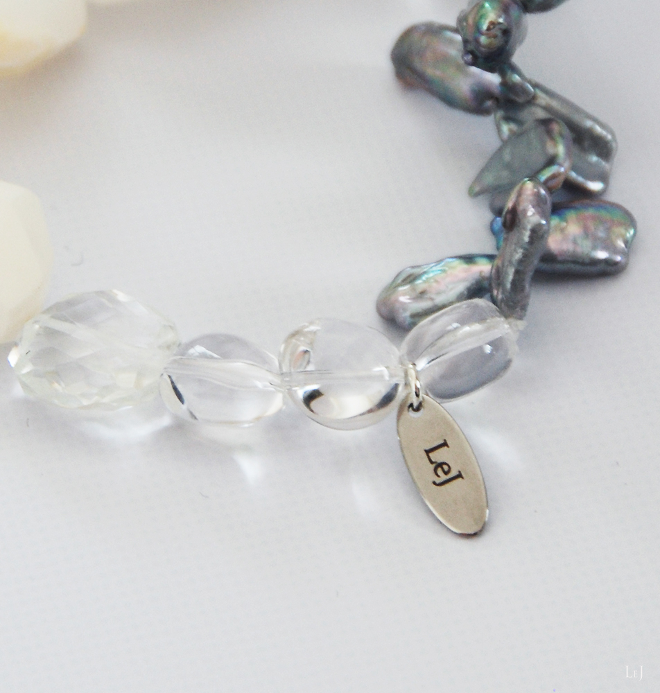 艶やかなメタリックグレイのケシパールをメインに、ハンドカットのクリアクォーツとタンブルのクオーツ、温かみのあるホワイトオパールを添えたブレスレット。
