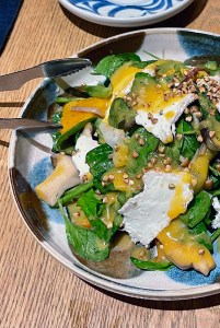 先日何気なく撮らせていただいた写真のサラダ、旬の葉物と柿とマスカルポーネ、マッシュルームが入っていました。これをそっくりそのまま真似をして、明日はビーフストロガノフです。なのでサワークリームを買いにまたマーケットに行ったのでした。