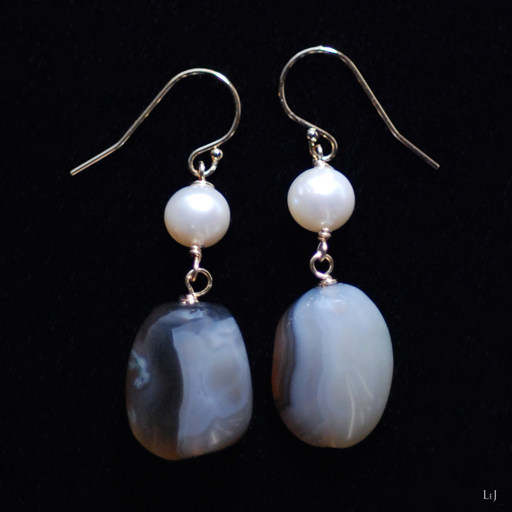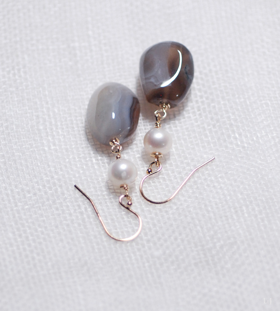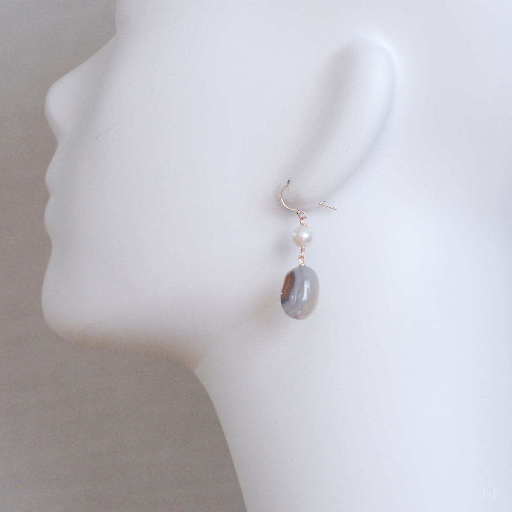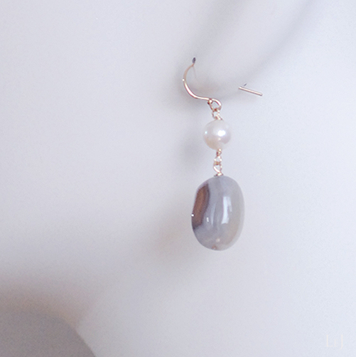 ピアスホールからの長さは42mm。タンブル形状のアゲートは15×12×8mm。パールは径7mm。さりげないけれどなんだか手に取る、そんなピアスになりました。細番手のニットにシンプルなネックレスと合わせていただくとバランスが良さそうです。