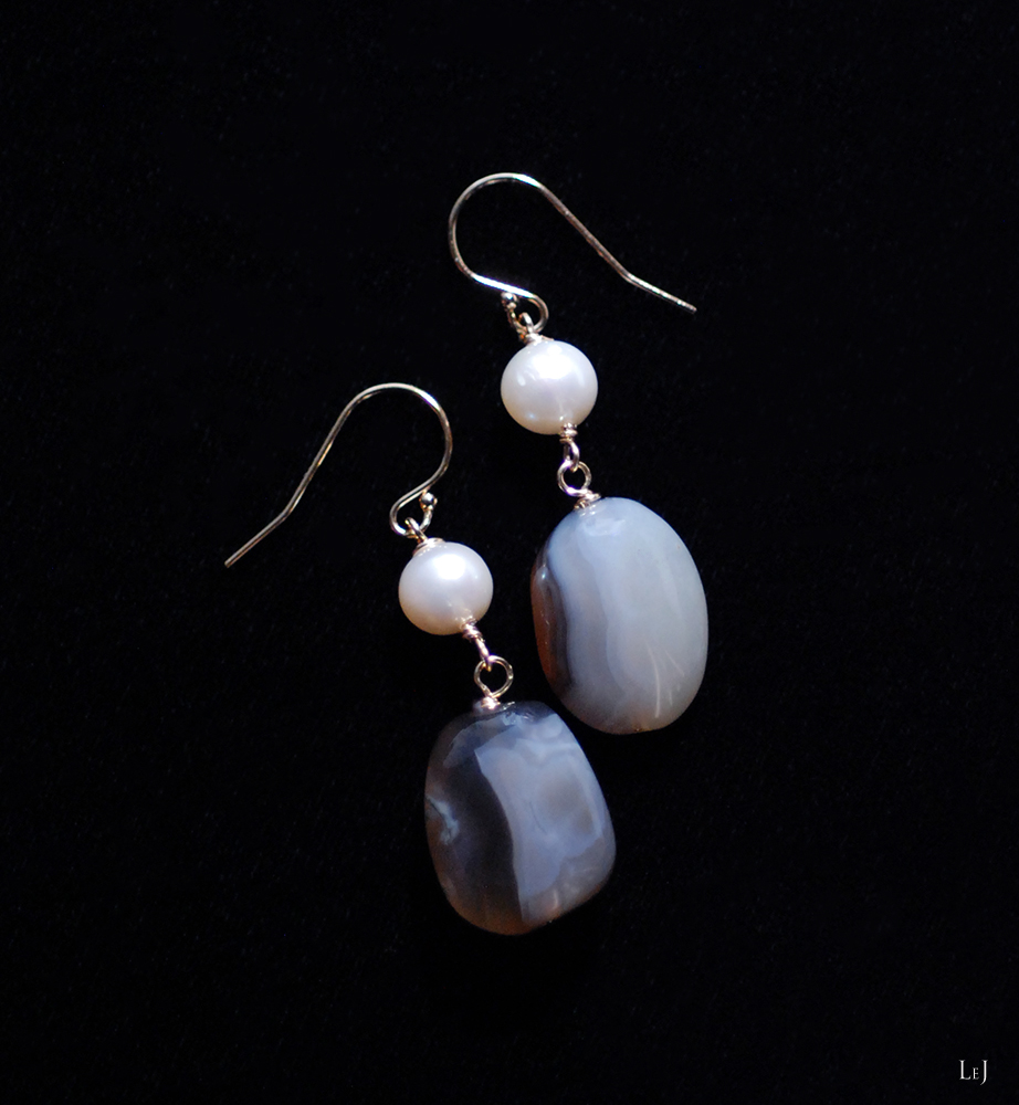 すべすべした、グレイ系〜ブラウン系のアゲートとパールのピアス。ゴールドとの組み合わせがとても綺麗です。