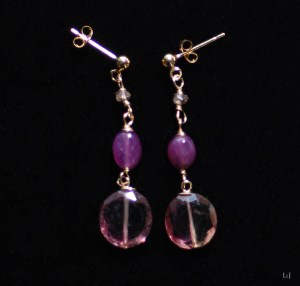 美しいカッティング、大粒のウォーターメロントルマリンとルビーを合わせて、ラインが綺麗に落ちるように天然ジルコンを加えてピアスを作りました。