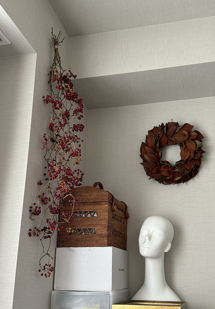 写真は私の作業部屋で、マグノリアのリースや山帰来の長い枝、バリ島のアマンダリで買って帰ったアタのカゴなどが仲良くしています。