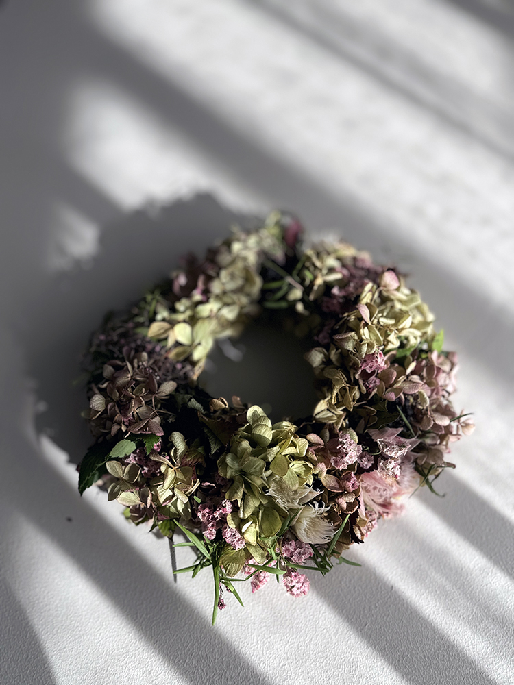 それから3日ほど経ち、だんだんとドライになるものや水がなくても開いてくる花があって様子が変わってくるのが毎朝楽しみです。引っ越して新しい部屋になってからまだ壁には何も飾っていないので、このリースはキャンドルを飾ることにしようと思います。