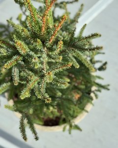 今朝、画像のカナダトウヒが大きな箱に入って届きました。すぐに開けて水遣りをしてバルコニーへ。