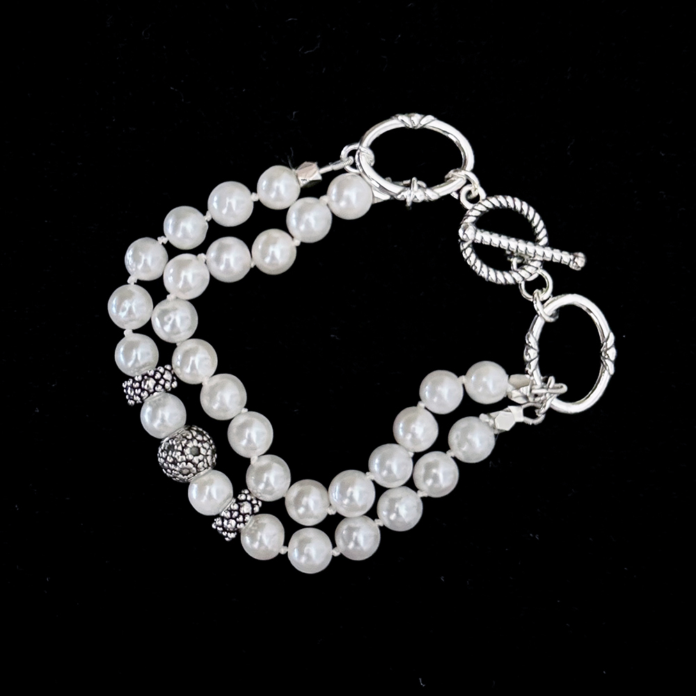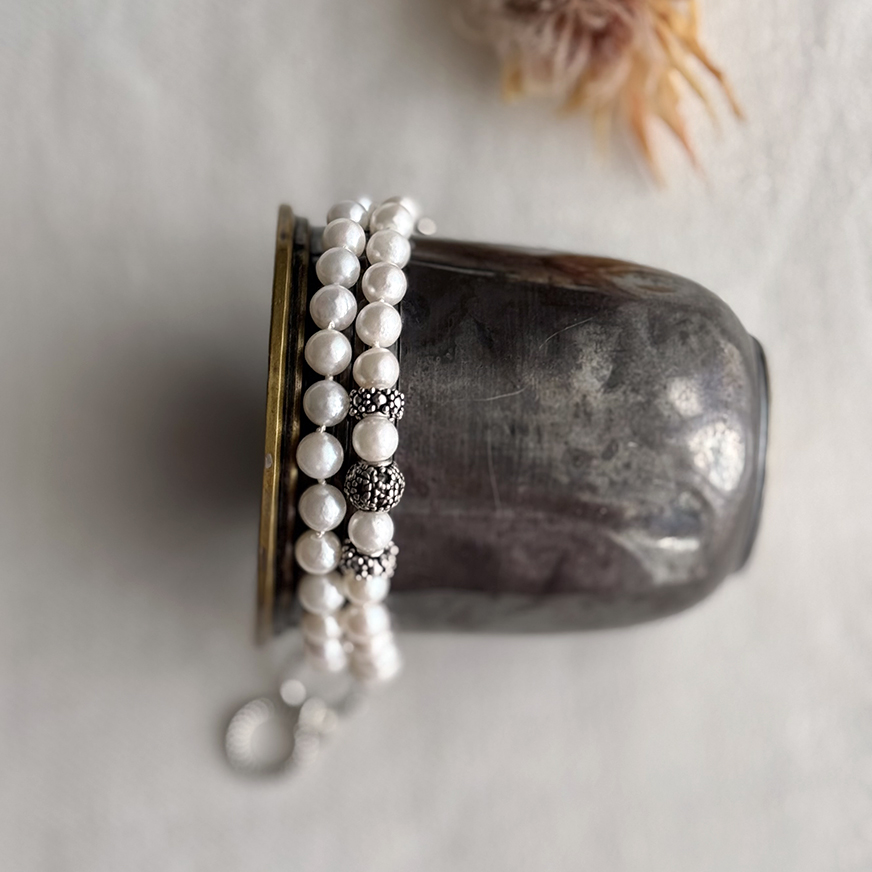 アコヤパールで作ったブレスレットにマーカサイト、シルバー925のクラシカルなパーツを添えました。