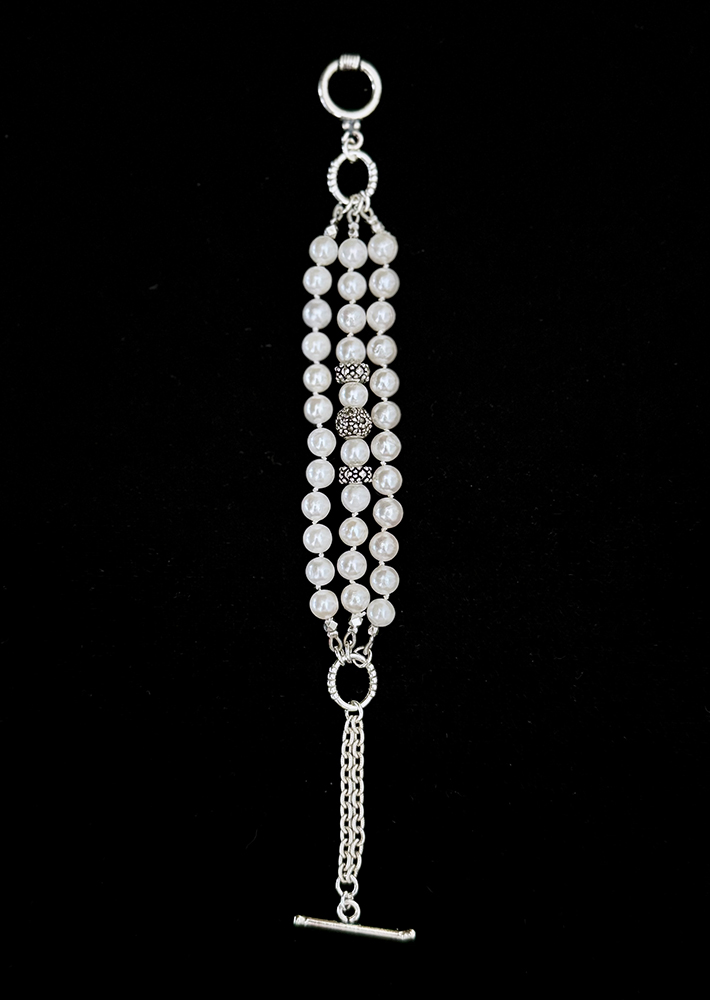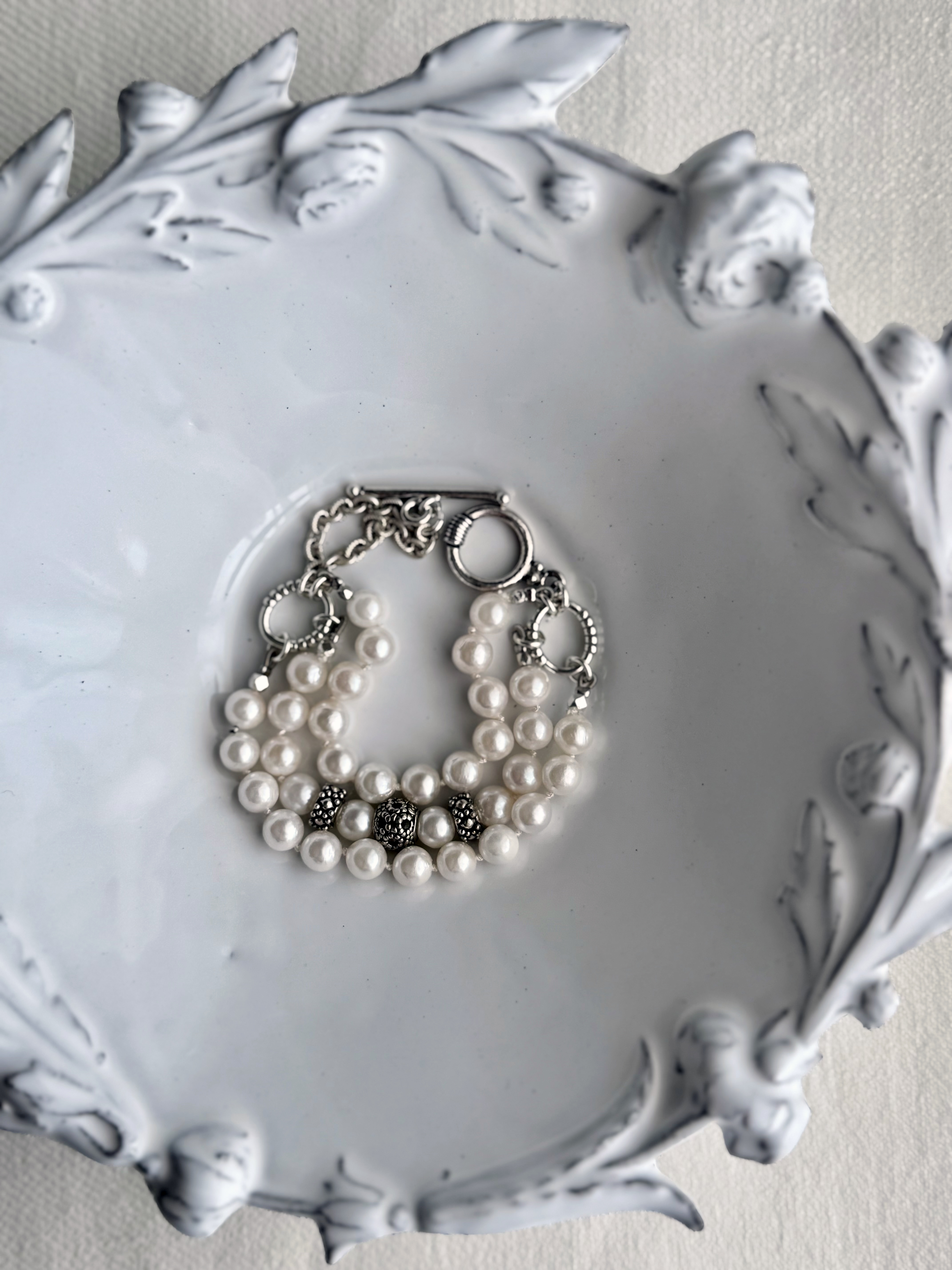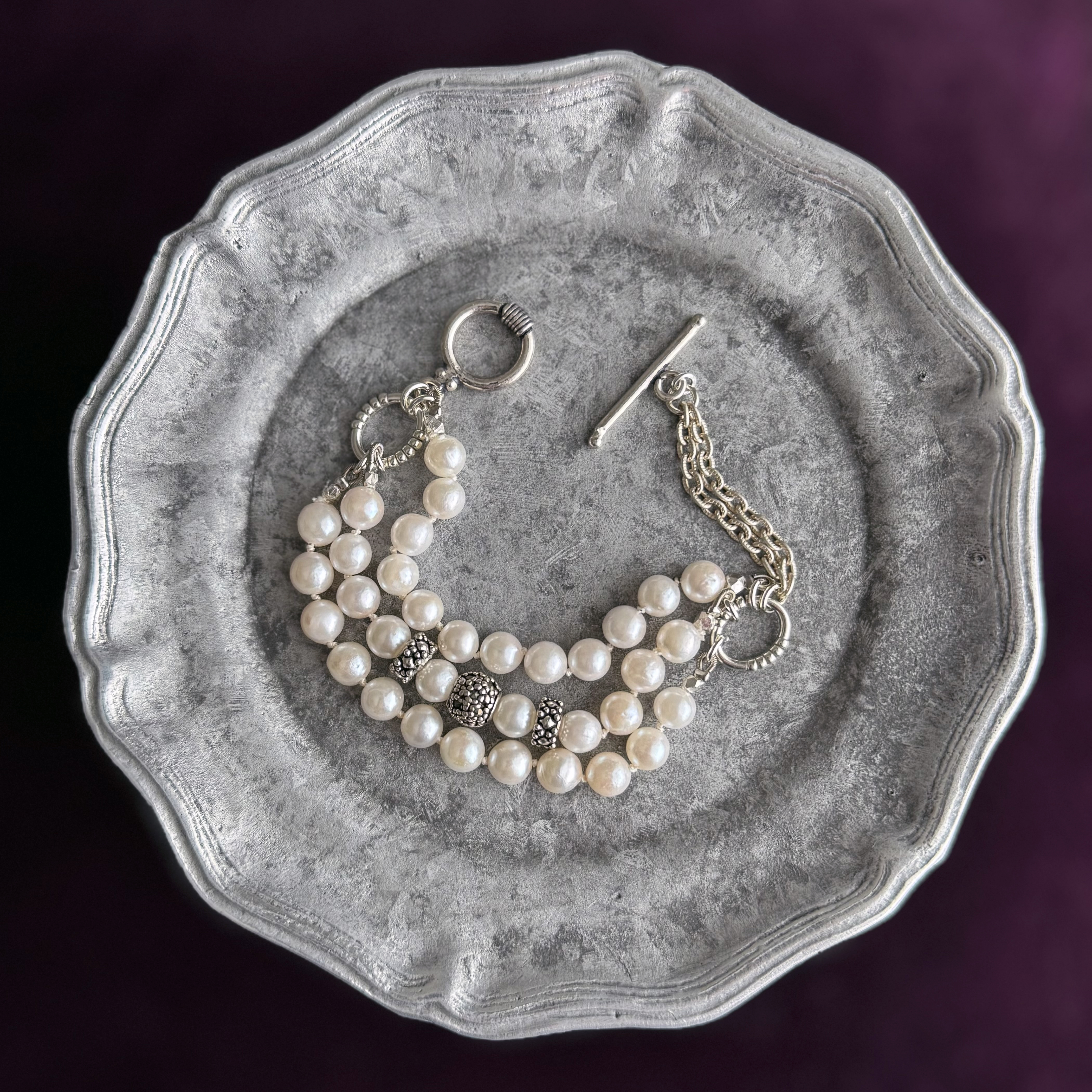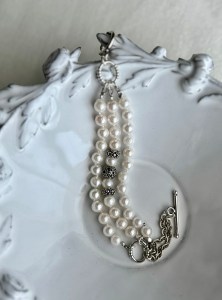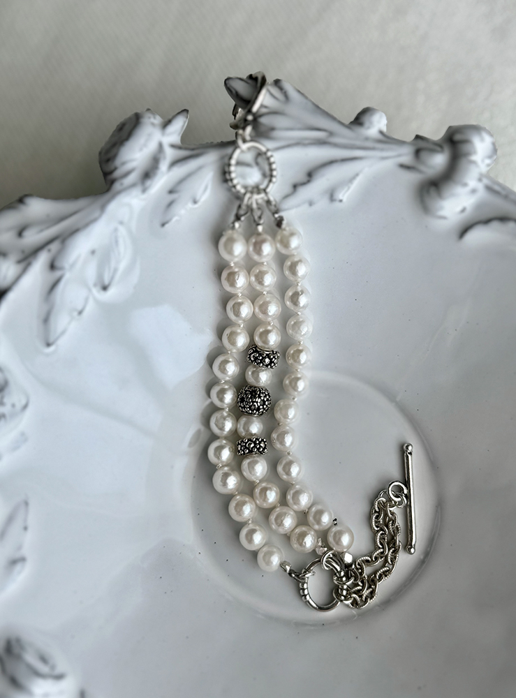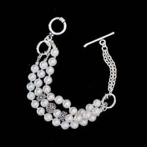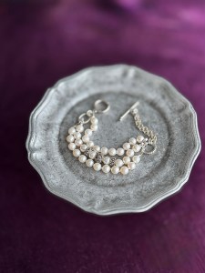 アコヤパールで作ったブレスレット、クラシカルなパーツとヴィンテージテイストのチェーンを添えました。