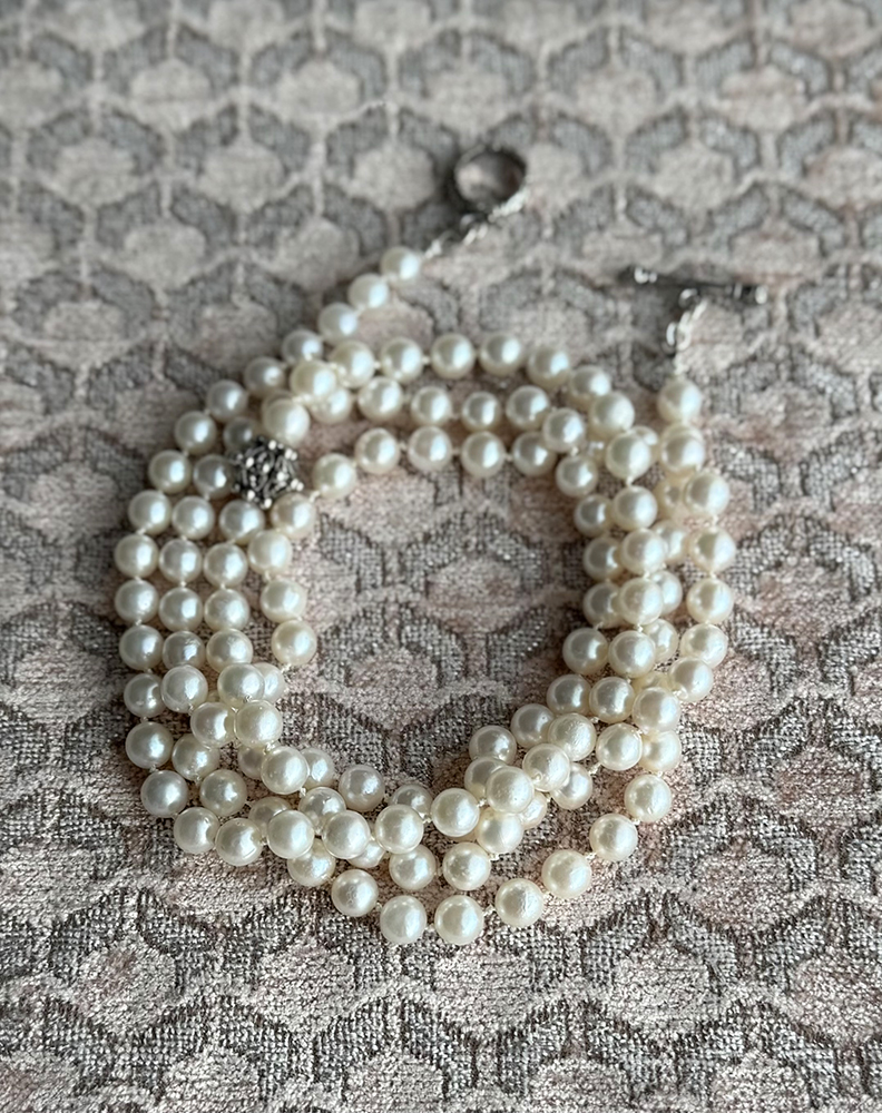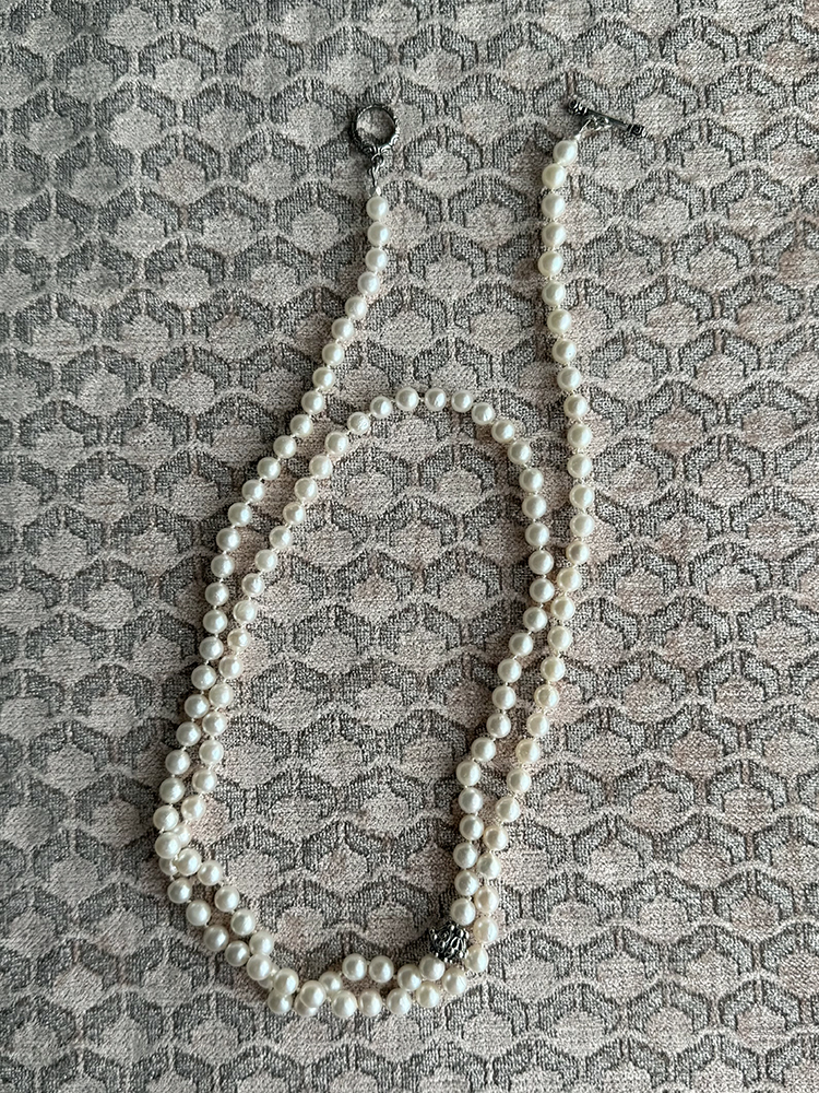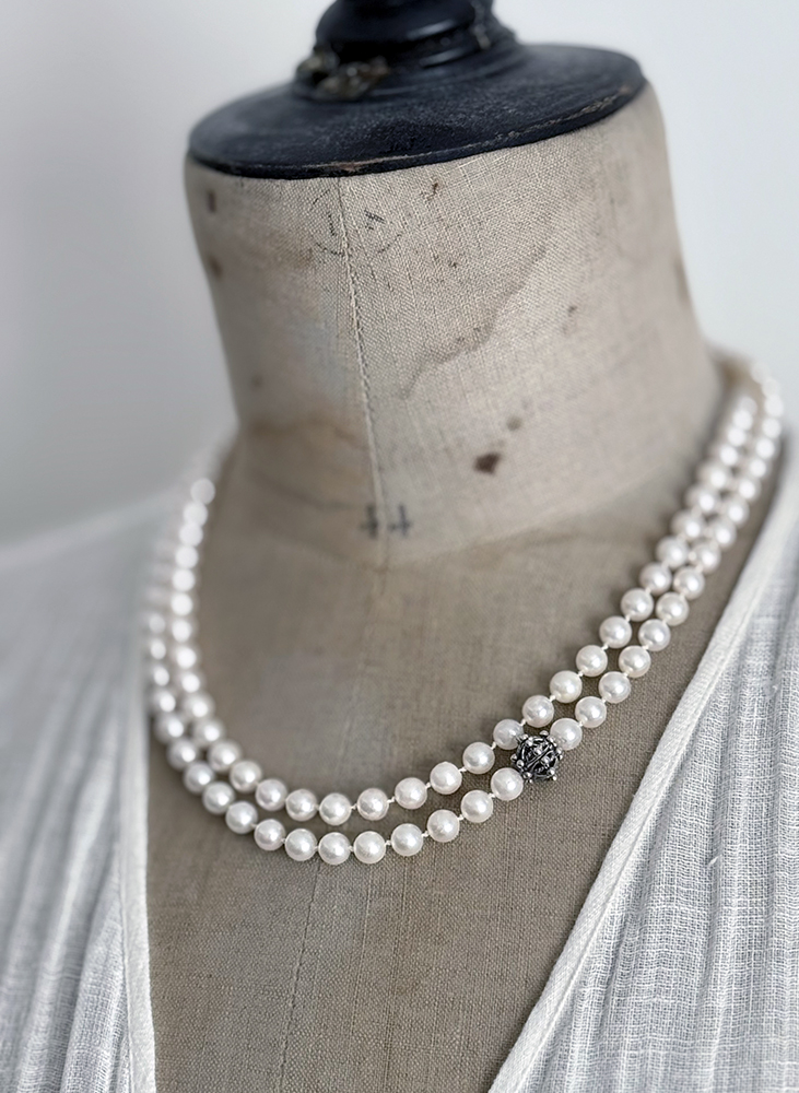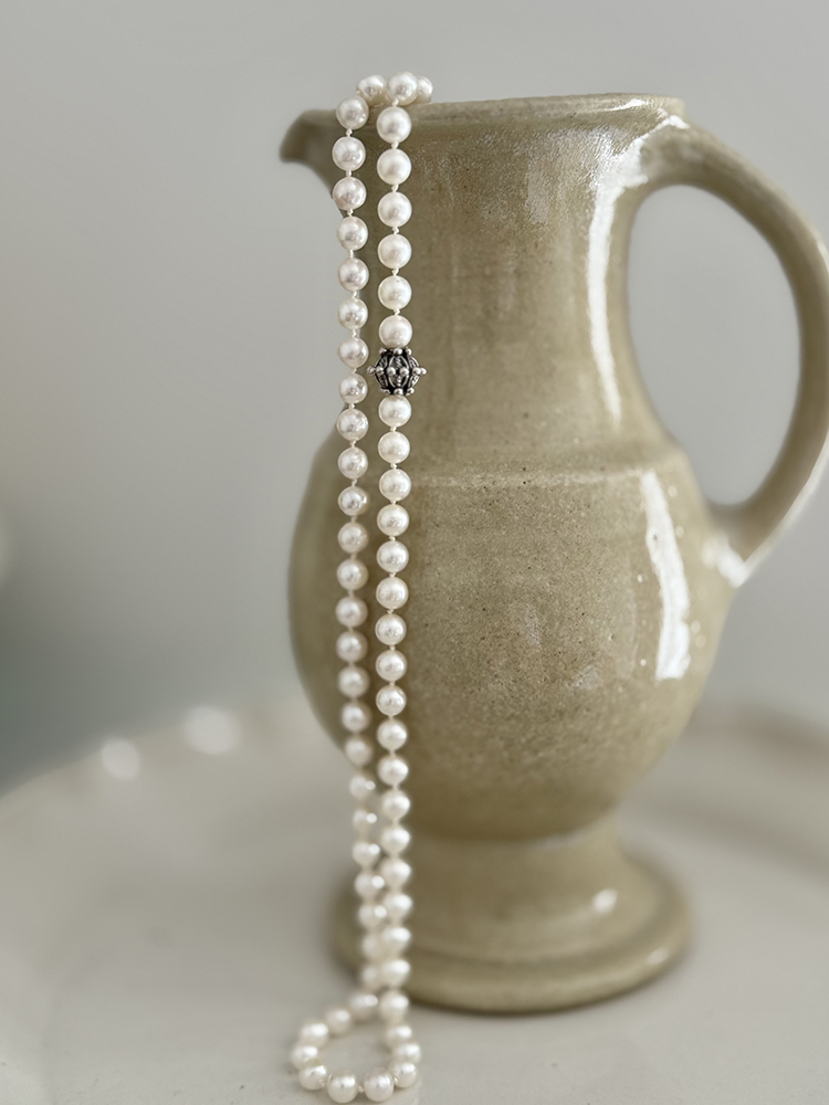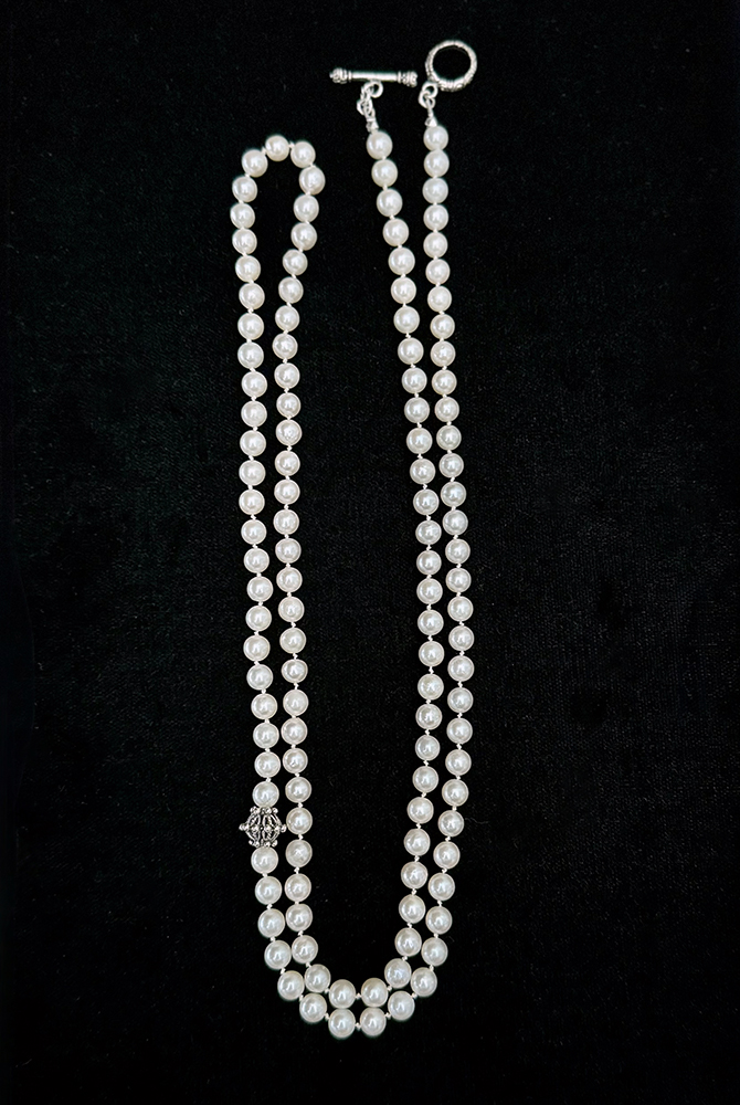 長さは95cm。2連でも着けていただけます。シンプルなニットに合わせて、シルバーのバングルやピアスにも合わせて、アコヤパールの普段使いをお楽しみください。