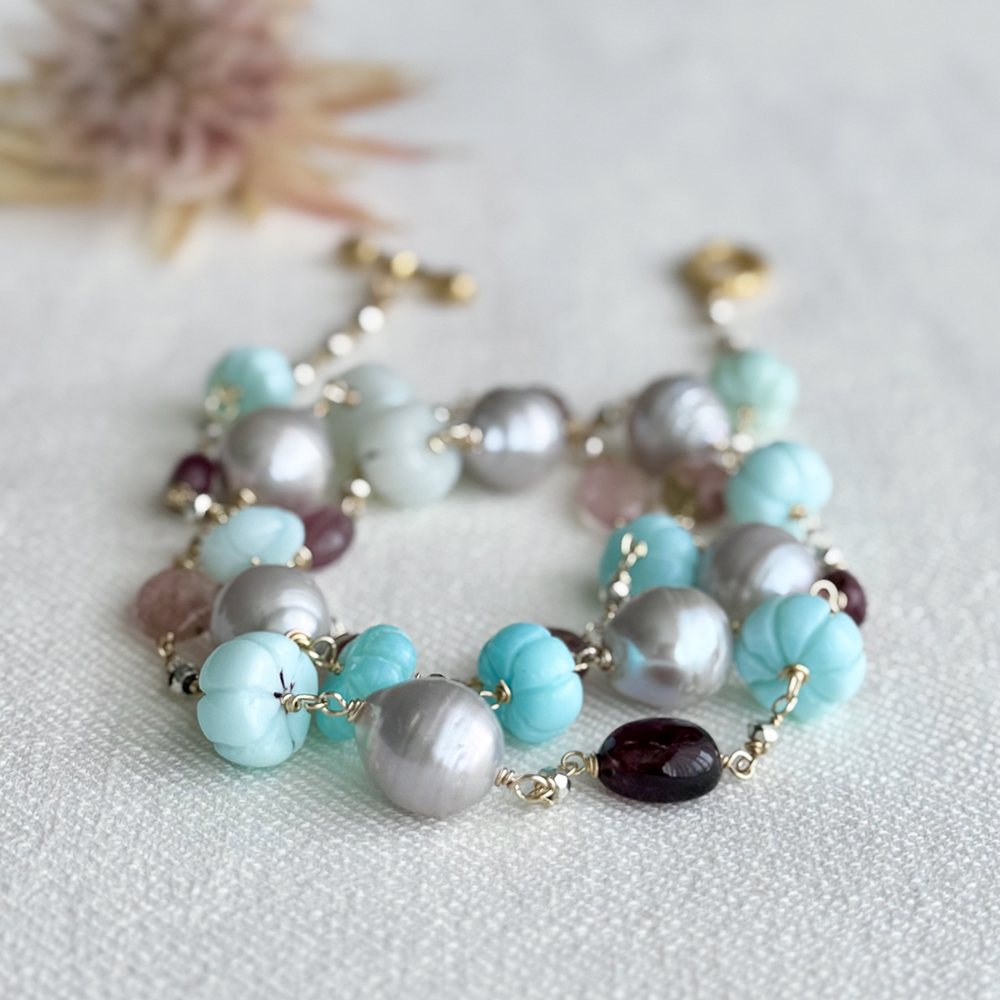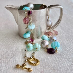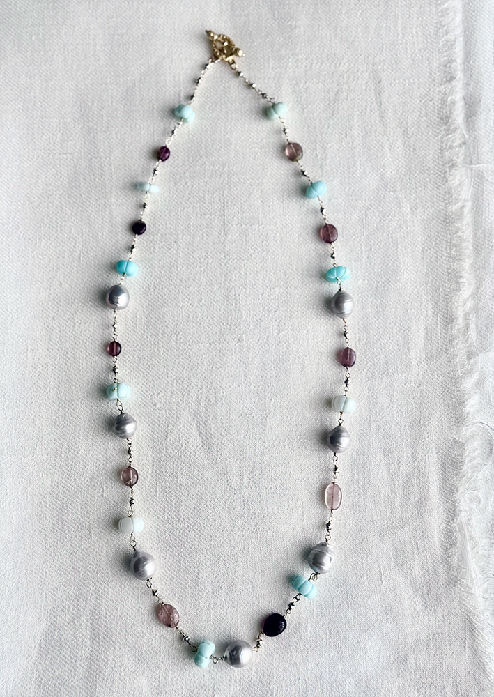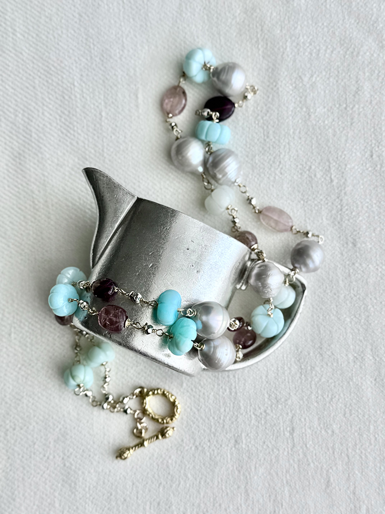 長さは66cm。シャツやニットの胸元に、LeJが大好きな天然石を散りばめて、ジュエリーの愉しみをたくさん感じていただけたらと思います。この秋に、一番華やかなジュエリーです。