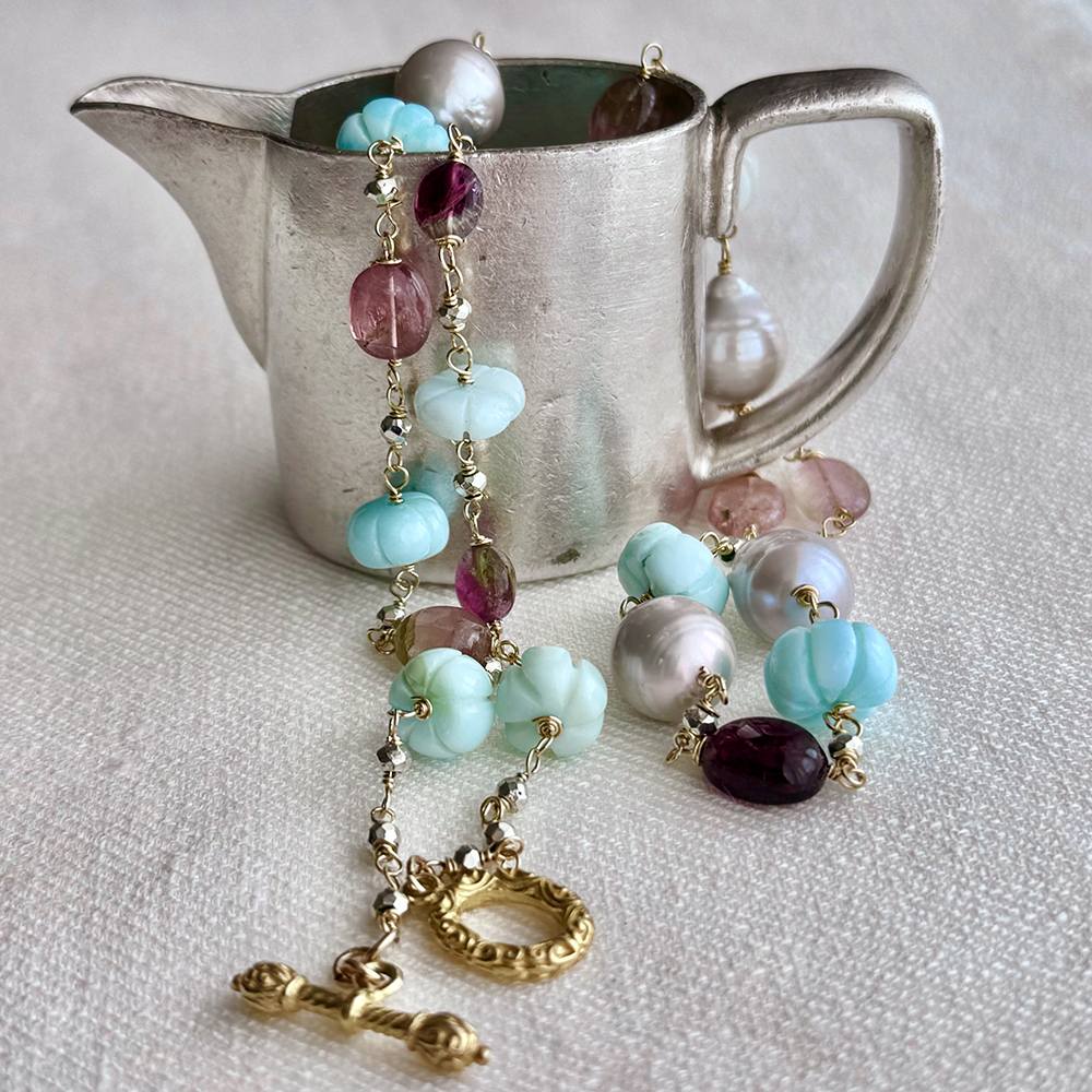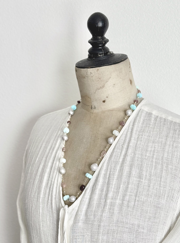 ブルーオパールのカーヴィング、ピンクトルマリンやバロックパール、パイライトの、愛らしい花が咲いたようなロングネックレス。Fiore=イタリア語で花の意味 と名付けました。