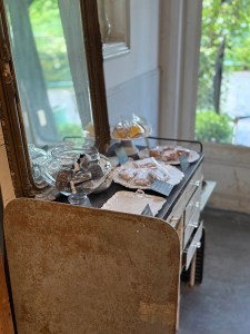 場所は、東急東横線の沿線にある駅から徒歩8分ほどの、パティスリー&レストラン。フランスアンティークで、落ち着く雰囲気と自然光が入る空間、穏やかなオーナーのマダムが素敵です。そのお店をお借りして、11時からの開催で5時間の内容です。画像は、そのお店の焼き菓子と室内の様子です。
