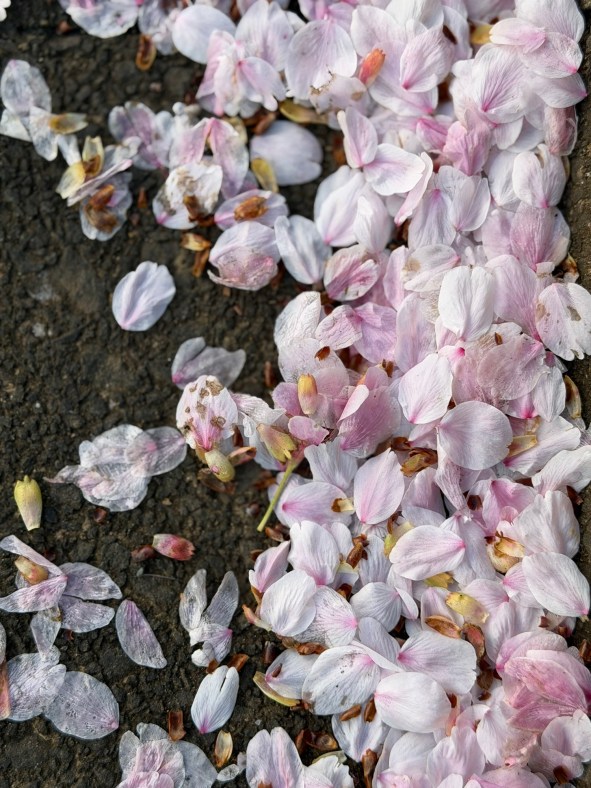 東京では風雨の日が2日続いて、近くの桜は花吹雪になっています。