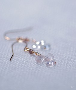 ピアスホールからの長さは33mm。アクアマリンは6mm、天然ジルコンは径3mm。ジルコンをLeJで使うのは初めて、スモーキークオーツよりも穏やかなグレージュの色味、光の屈折率の高い、キラキラと光を反射する美しい天然石です。