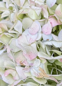 真っ白から咲き始めたいつもの紫陽花が、ピークの頃を過ぎてこんな風になっています。
