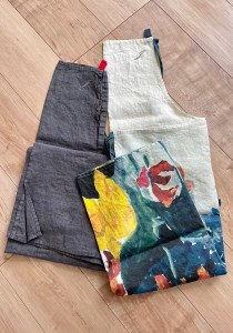 数日前に画像のエプロンが届いて、ちょっとよい気分です。リトアニアのリネンにJのイニシアルを入れていただいて、仕上がりを待つ間5日間ほどでした。丁寧な刺繍で、あぁ嬉しいです。一点はダークグレイ、もう一点はバストから下が大きな花柄。汚れも気にせずがんがん使えそうです笑。