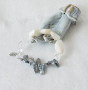 艶やかなメタリックグレイのケシパールをメインに、ハンドカットのクリアクォーツとタンブルのクオーツ、温かみのあるホワイトオパールを添えたブレスレット。