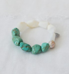 甘いグリーンがかったターコイズはメキシコ産、近年あまり見なくなっている大粒タンブルのホワイトオパール、そして、そっと一粒、柔らかさを添えるために有核バロックパールを添えたブレスレットです。