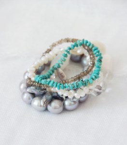 夏のドレスに、シルバーのジュエリーに合わせて、バングルのように楽しんでいただける仕上がりです。ホワイトとミルキーホワイトとがやわらかに溶け合うオパールは幸福の石と言われ、ターコイズはお守りのような石とも、パールは愛情の象徴、そんな意味を知るのも一つの楽しみかもしれません。
