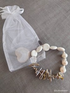 クールさと温かみとをバランスよく合わせて、着けるととても華やかな仕上がり。Tシャツに合わせたりマキシ丈のドレスに合わせたり、ノースリーブのウエアにシルバー925のジュエリーとコーディネートしたりなど楽しんでいただけそうなブレスレットになりました。お手持ちのパールのブレスレットやクリアクォーツのパワーストーンとも仲良くなれそうです。