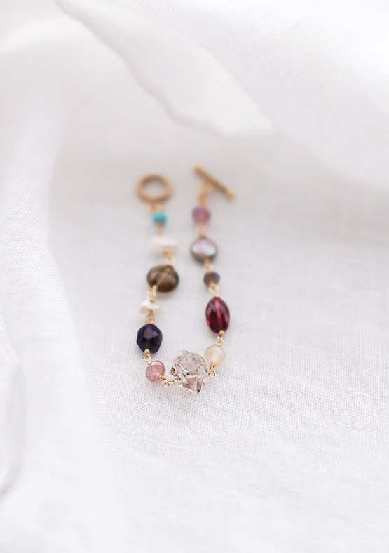 まだ訪れたことのないリゾートの海への憧れをもって作った、ハーキマーカットクオーツをメインに個性溢れるシェイプのターコイズやけしパール、抑えた色のオレンジムーンストーンのブレスレット。天然石素材とヴェルメイユのゴールドとのバランスがぴったり合った、とても美しいアクセサリーです。