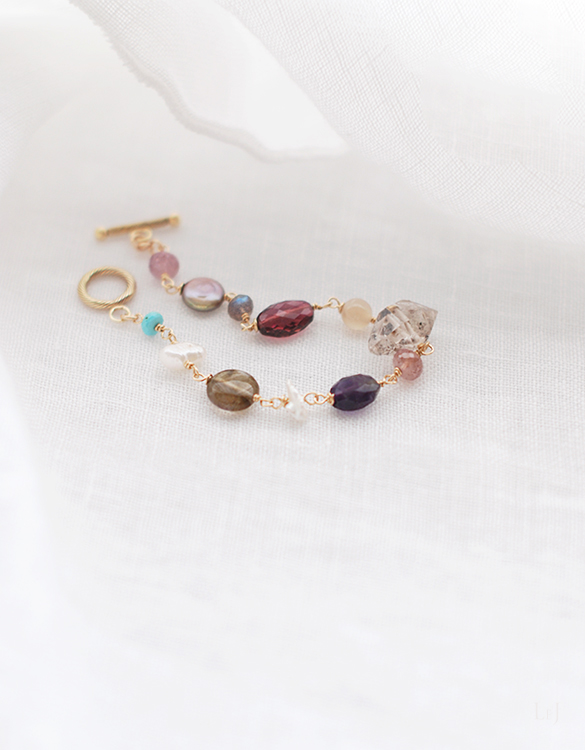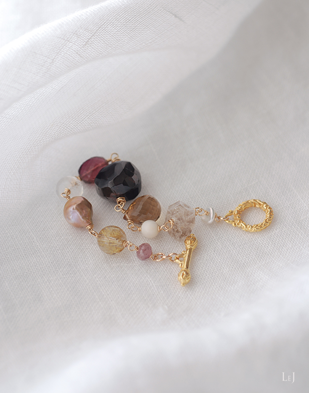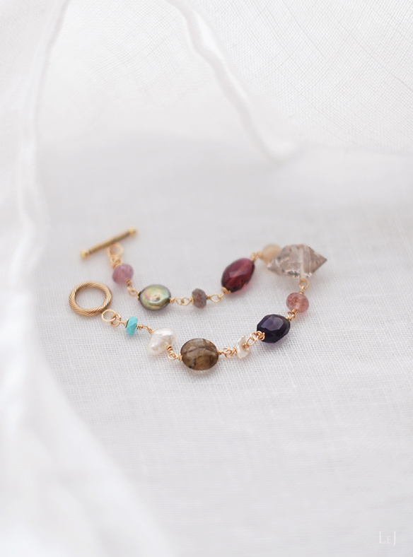 金属パーツは14Kゴールドフィルドとヴェルメイユ。全長18,5cm。リストサイズ15cm〜16cmの方にほどよくフィットします。サイズ調整はお気軽にお申し付け下さい。