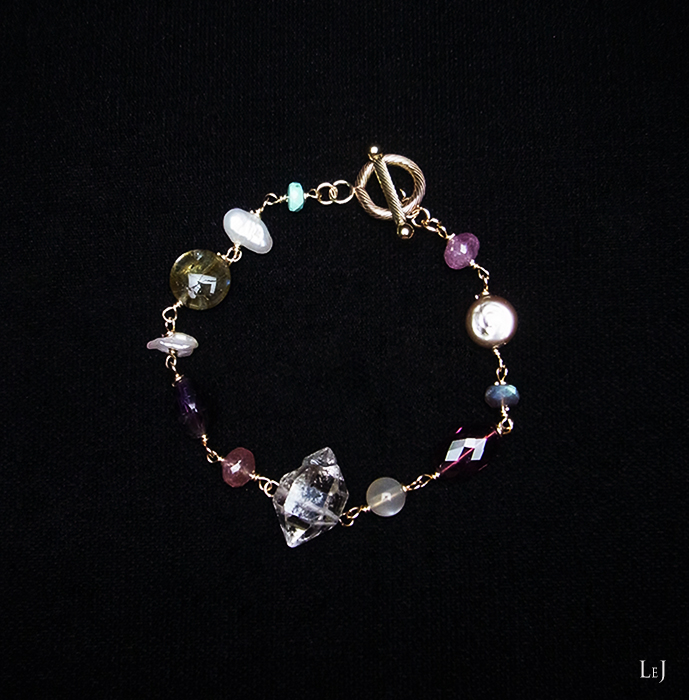 右端から、サファイア、コインシェイプの淡水パール、ラブラドライト、トルマリン、オレンジムーンストーン、ハーキマーカットクオーツ、サファイア、アメジスト、けしパール、ラブラドライト、淡水パール、アリゾナターコイズ。マンテルには、とっておきの14Kゴールドフィルドパーツを使いました。