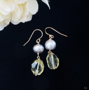 抑えたトーン、美しいカッティングのトルマリンとアコヤパールで、アシンメトリー・シャンデリア型のピアスを作りました。