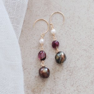 ほんの少しのグレイが混ざったダークブラウンゴールドの淡水パール、赤ワイン色のトルマリンとアコヤパールのピアス Dolce70。