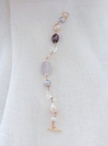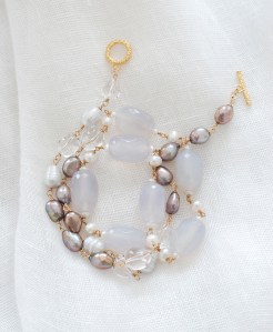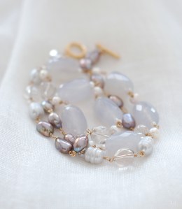 カフェオレ、カプチーノ、ミルクティー色のパールがゆらぐトーンにライラック色のカルセドニーを添えて、しっとりと秋のはじめのPaméla-b(パメラ)ブレスレットを作りました。