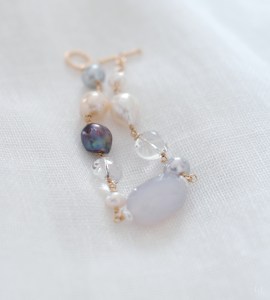 LeJのパールのストックから、表情ゆたかなひと粒ずつのパールを選びました。この世にたったひとつ、お手元に届くように生まれてきた、そんなジュエリーです。内径15cmの方にほどよくフィットします。長さの調整はお申し付けください。カルセドニーの微睡むようにとろりとしたカットとパールの優しい光沢と発色がとてもきれいです。