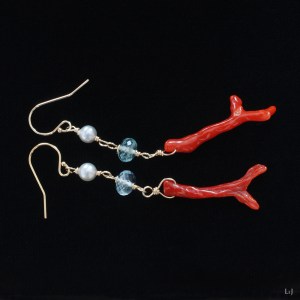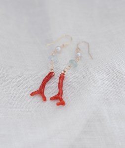 美しいフォルムのブランチコーラルを、ややグレイがかったアコヤパールと、繊細なカットがほどこされた薄い水色のベリルと合わせました。このピアスも、近日中にONLINE STORE公開します。