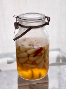 糠漬けの容器を冷蔵庫へ、実山椒の醤油漬けやオリーブオイル漬け、早めに本漬けに入った梅干しやらっきょう漬けなどでいっぱい。そしてさらに本漬けに入ろうとする状態の梅までもが入って来ました。