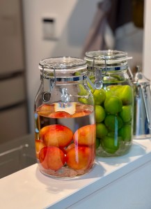 今年は4Lの容器に梅酒、2Lにはプラムと、青梅のリキュールのバラエティを増やして作りました。しばらくの間は眺めて楽しむことにします。