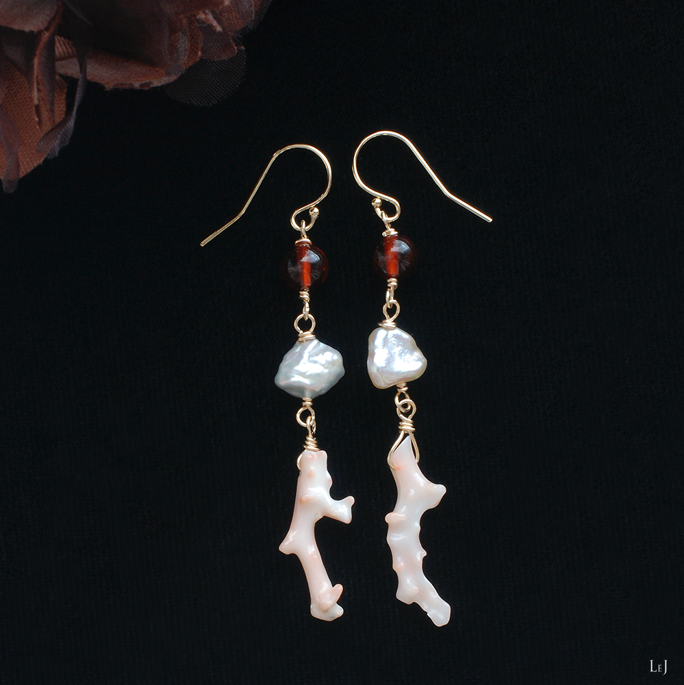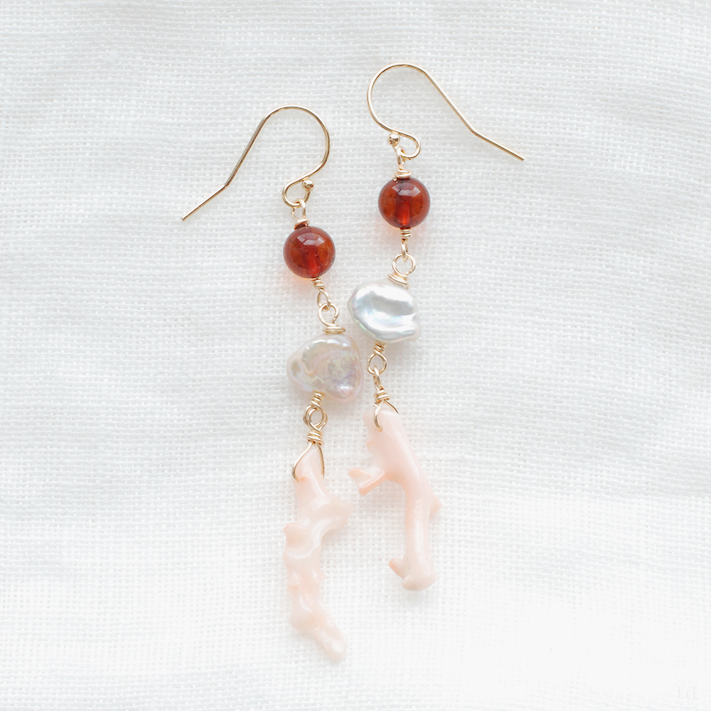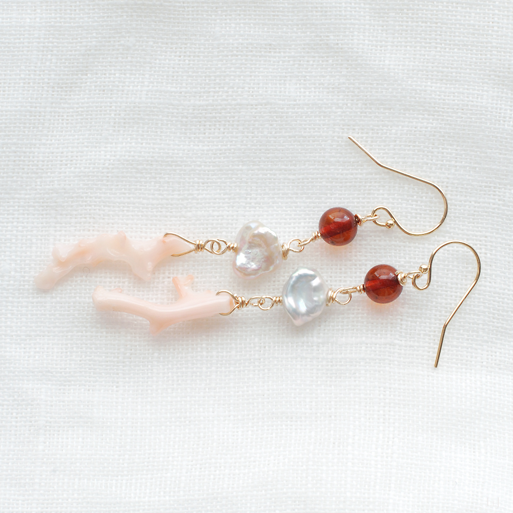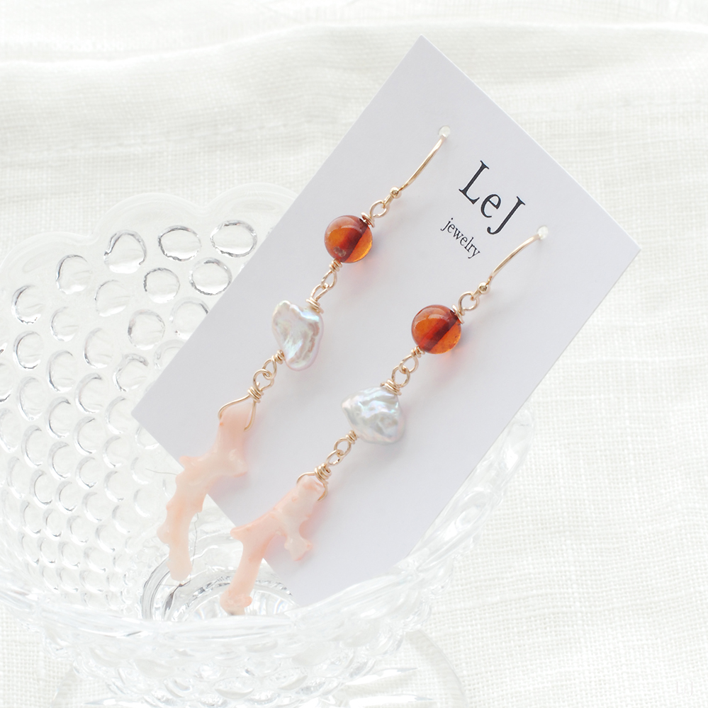 Dolce32は、琥珀とケシパールとピンクのブランチコーラルのピアス。
